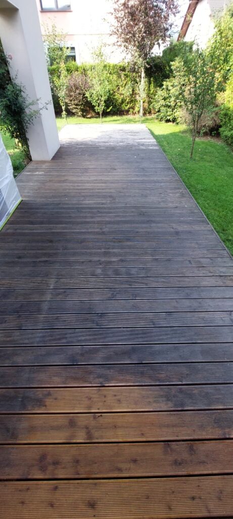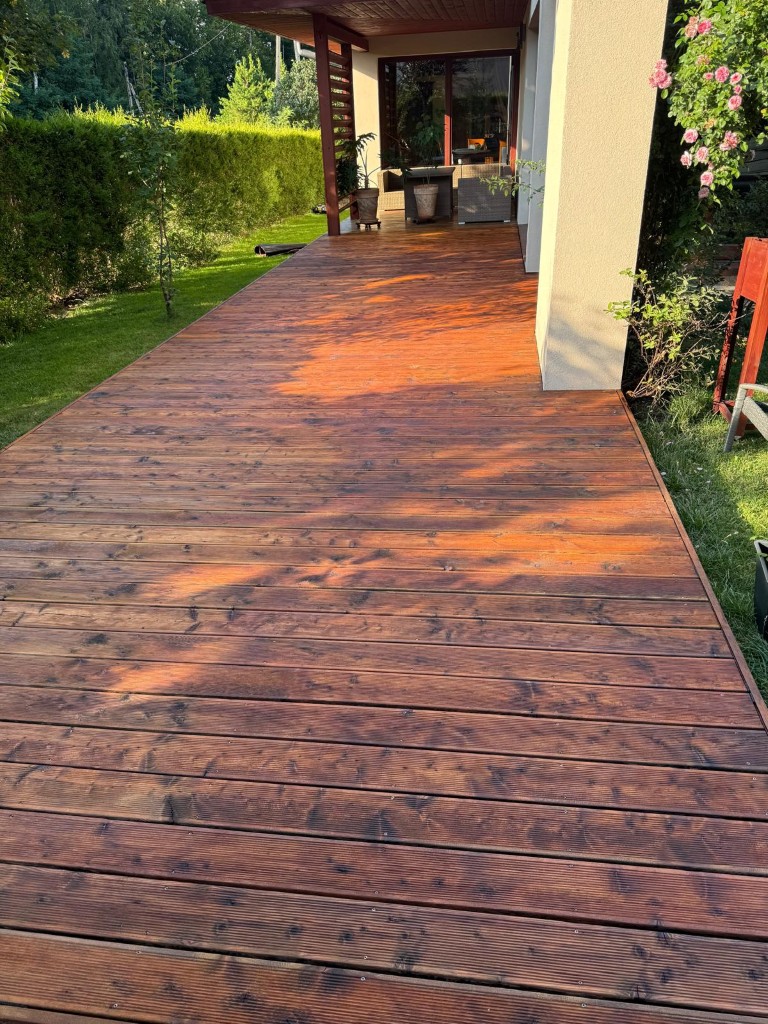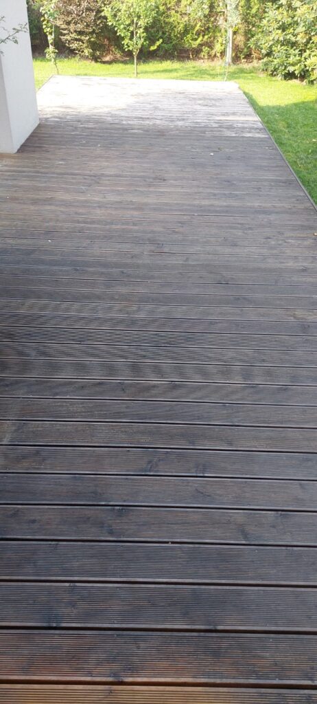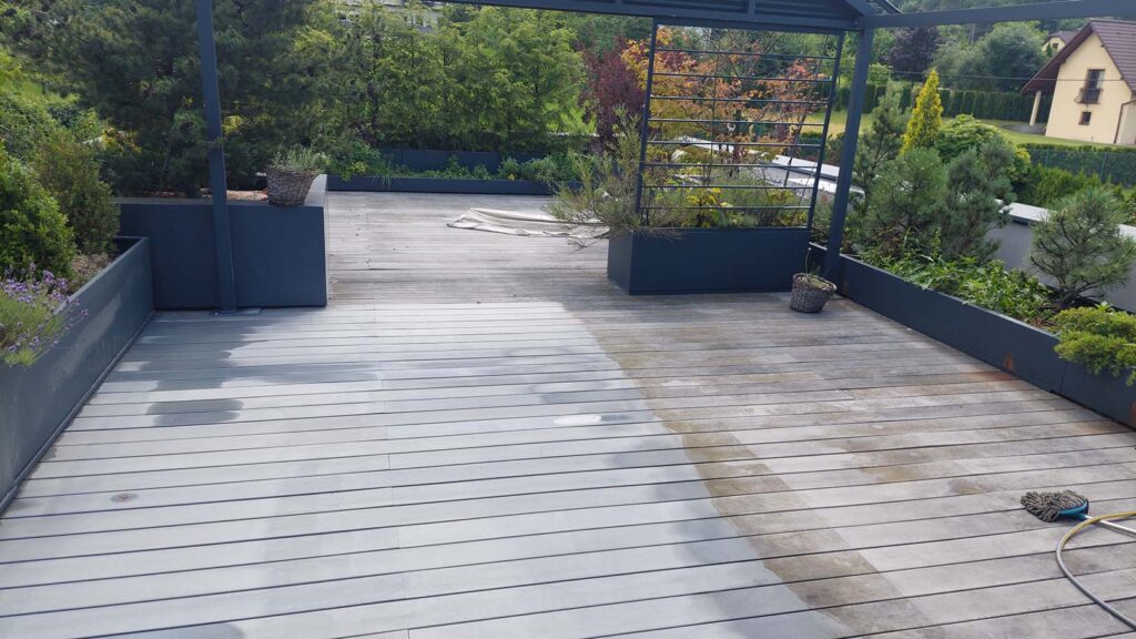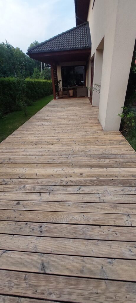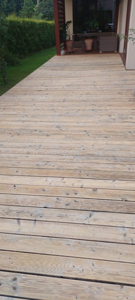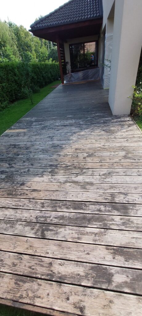 Czyszczenie standardowe polega na użyciu szorowarki do desek tarasowych oraz chemii do renowacji drewna. Szorowarka dba o to aby brud i glony na deskach zostały fizycznie usunięte, a chemia dodatkowo ułatwia ten proces rozpuszczając wierzchnią warstwę starego oleju oraz brudu.